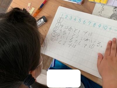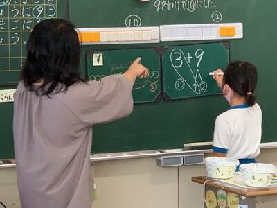 「3+9」の計算を「ブロック」「さくらんぼけいさん」「ず」「ことば」の4つの方法を使って解きます。キーワードは「10のかたまりをつくる」です。子どもたちは「3を2と1」にわけたり「9を7と3」にわけたりしながらがんばって10のかたまりをつくっていました。