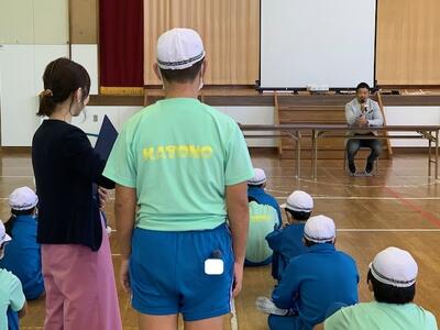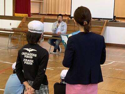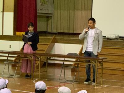 はじめに体育館で「あきらめない気持ち」というタイトルでご講演いただきました。子ども達に伝えたいことは2点です。「いろいろな場面で勇気をもって『アピール』すること」「英語を一生懸命勉強すること」です。世界の舞台で活躍してきた田中選手の体験からの言葉だったので、子ども達も大きくうなずきながら真剣に聞いていました。