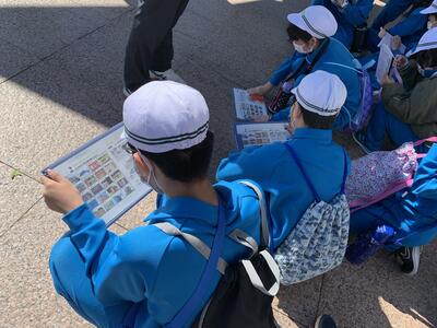 いよいよ活動が始まりました。はじめは屋外フォトラリーです。カードにのっている20枚の写真がどこにあるか見つけます。さて、何枚見つけられるかな?