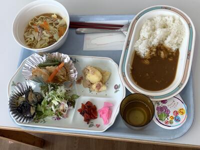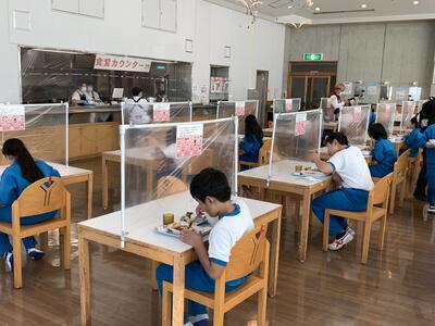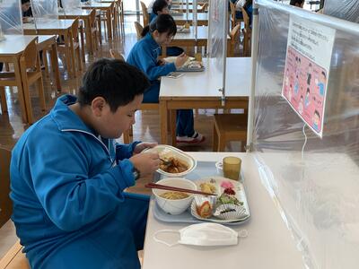 昼食のメニューはカレーライス、みそラーメン、餃子、ジャーマンポテト等です。全員同じ方向を向いて、もちろん黙食です!