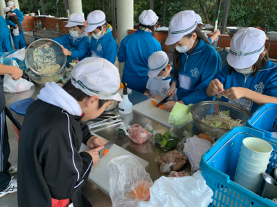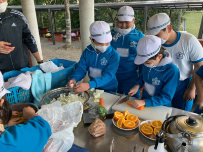 2021年10月21日 18時04分今日の夕食は焼きそばです。包丁を持つ手が少し自信なさげですが、みんなで協力して頑張りました❗️