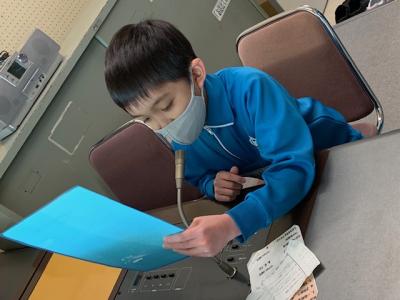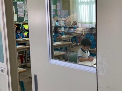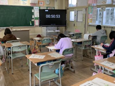 現在子どもたちは「漢字能力検定(通称:漢検)」を受験しています(希望者のみで全児童ではありません)。普段の地道な積み重ねが合否を左右します。60分間という長丁場ですが、1年生も頑張って問題に取り組んでいました。