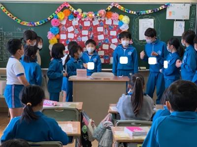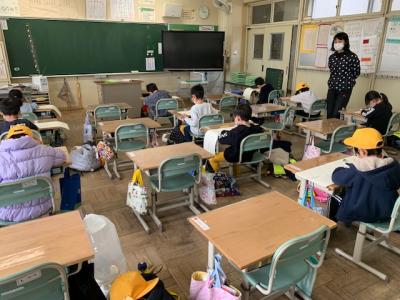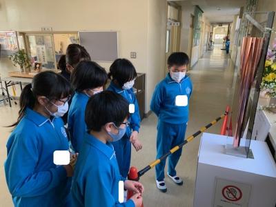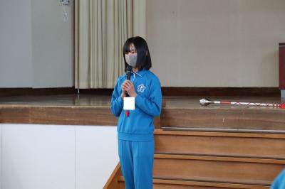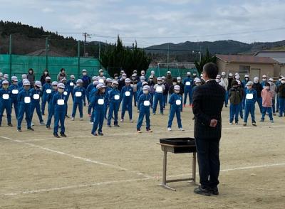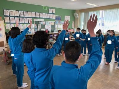2つ目は「東日本大震災」に係る内容です。校長先生から地震が発生した時刻、亡くなった方もたくさんいること、津波に飲み込まれ10年たってまだ見つかっていない方もいること、その後原発が爆発し、自分の家に帰れなくなった人もいること、等のお話がありました。3月11日(木)の午後2時46分には学校にいる児童・職員全員で黙祷をささげます。(黙祷の経験がない児童も多かったので、全校生でちょっと練習をしてみました。)