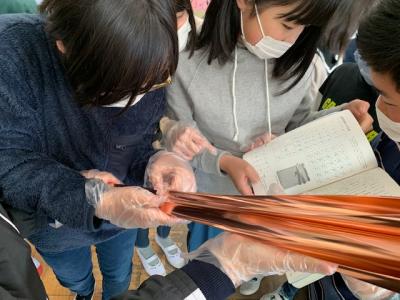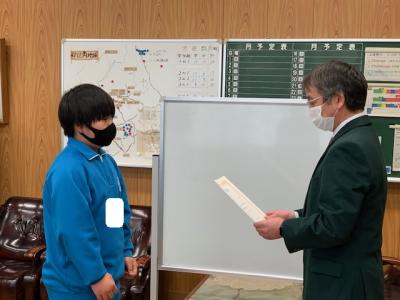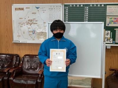 2つめは校内書き初め会です。「金賞」の児童たちを代表して6年生男子が賞状を校長先生からいただきました。