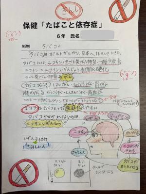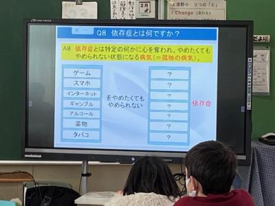 先日学区内の内科医の先生(本校の保護者でもあります)をお招きし「タバコと依存症」の特別授業を行いました。
