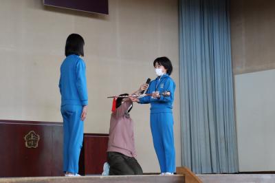 3つ目はお楽しみ、「ミニ・ポイントオリエンテーリング」の答え合わせです。運営委員会の児童が前に出て進行しました。各学年とも出した答えは「6年生いままでありがとう」ということでしたが…。