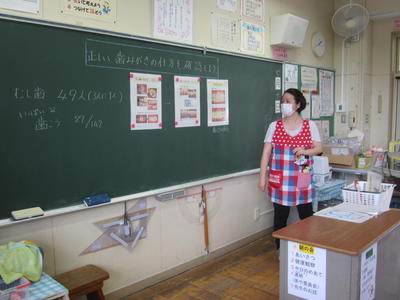 今年はコロナウイルス対策で、例年行っている染め出し剤による着色(磨き残しの部分を赤く染める)は行いませんでしたが、児童たちは手鏡を持参して、自分の歯の磨き方を確認していました。虫歯の治療率を向上させることは、本校の大きな健康課題の一つです。毎食後、そして就寝前、しっかり歯の汚れを落とすことが大切ですね!