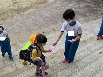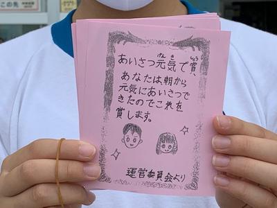 今週は雨続きですが、先週は運営委員会のメンバーが登校時に昇降口の所に立ち「おはようございます!」と元気な声であいさつをしていました。登校してきた児童たちも、少し戸惑いながらも「おはようございます」とあいさつを返していました。大きな声であいさつできた児童は、運営委員お手製の「あいさつ元気で賞」をもらえます。
