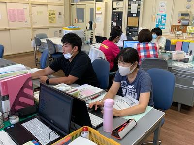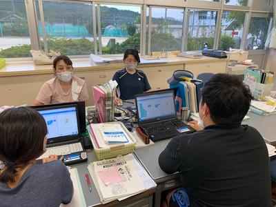 そしてこの「プログラミング教育」は私たち教職員にとっても新しいものなので、我々も研修を深めなければなりません。写真は本校担当が出張で学んできたことを、先生方全員に伝えているところ(「伝達講習」といいます)です。