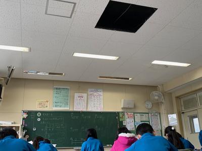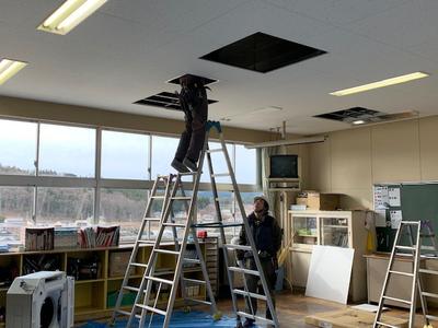 土曜日に各教室に大きな穴を開け、今日からの5日間で各教室にエアコン本体を設置します。本校では1日に2クラスずつ設置する予定です。