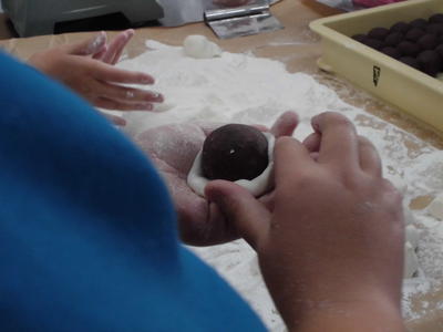 お店で販売しているおまんじゅうと同じ皮に、丸くしたあんを包み込みます(さすがにあんは事前に作っていただいていました)。できるだけ厚さが均一になるように、あんこ全体が見えなくなるように包みます。左手でクルクルまわしながら形を作るのに、子どもたちは真剣に取り組んでいました。