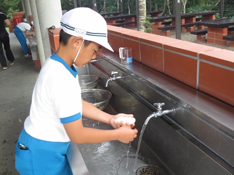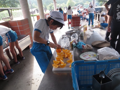 五年生、宿泊活動の様子です。協力してカレーを作りました。
