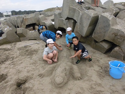 五年生、宿泊活動二日目!砂の芸術、いかだ作りのこどもたちの様子です。