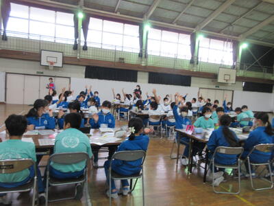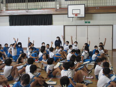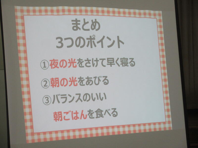 まず、朝何時に起きるか、昨夜何時に眠ったかという質問がありました。夜遅くまで、テレビやユーチューブを見たり、ゲームをしていると、朝起きられなくなり、食欲も出ないようです。幸せなサイクルとして、夜の光(ブルーライト)をさけて早寝⇒早起き⇒朝の光(体内時計リセット)⇒朝ごはん⇒体力・集中力アップを紹介してもらいました。