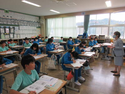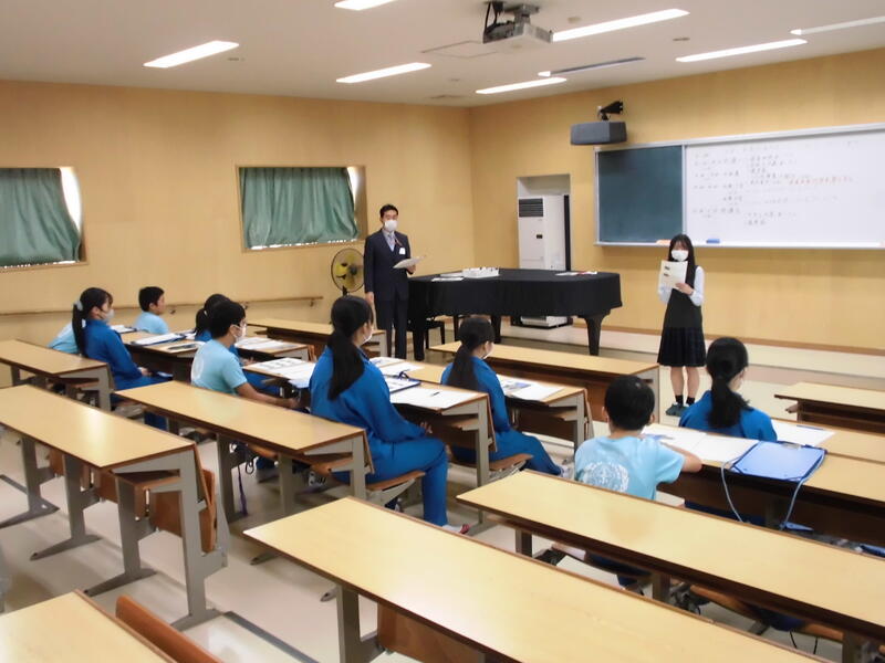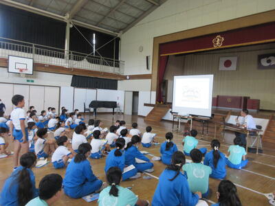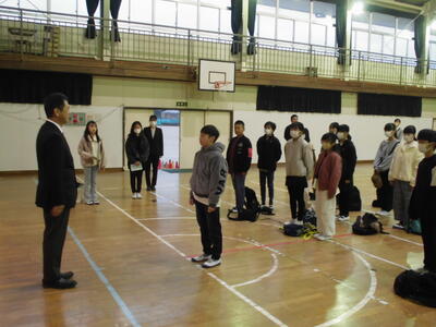 はじめに、小名浜海星高校の副校長先生より、水産についてイメージすることの質問を受け、高校生が勉強している水産の内容を体験してほしいとごあいさつをいただきました。続いて、教頭先生より、水産科の4つの学科と専攻科で学習する内容や取得できる資格について、説明をしていただきました。