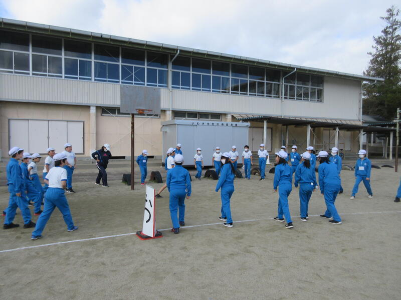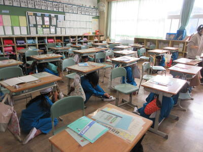 令和5年11月2日(木)、シェイクアウト訓練(安全確保行動訓練)を実施しました。この訓練は、地震が発生した時、自分の身を自分で守るために真っ先に行うべき安全確保行動「(1)まず低く、(2)頭を守り、(3)動かない」を学び、身に付ける機会として、実施するものです。訓練用音源を利用し、実際の災害が起こった雰囲気で、約1分間の安全確保行動を実施しました。