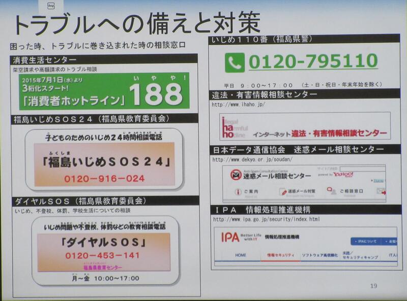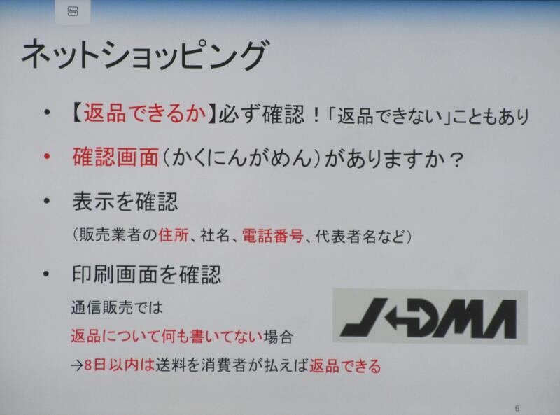 講座では、①ネットショッピングのトラブル、②ネット依存、③ネットいじめ、④ワンクリック詐欺、⑤オンラインゲーム高額請求、⑥SNSドラブルについて、具体的な事例に基づき、正しい対応の仕方を説明していただきました。例えば、ネットショッピングでは、返品できるか、日本通信販売協会の会員であるJADMA(ジャドマ)マークが表示してあるかを確認することが大切だそうです。小学生に多いゲームの高額請求、また、ワンクリック詐欺のトラブルは、すぐに消費者センターに相談することが解決の近道と分かりました。