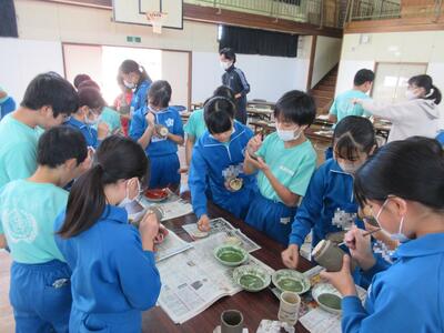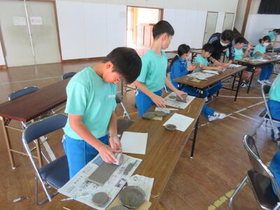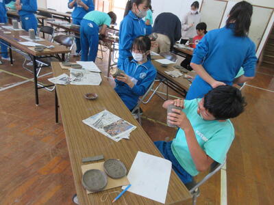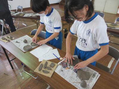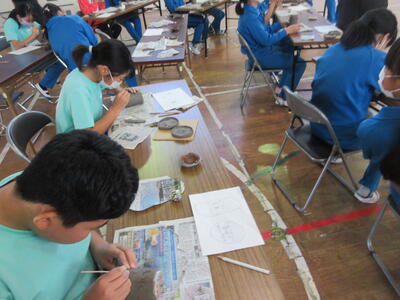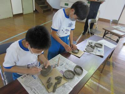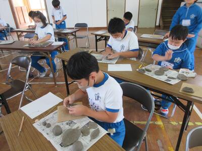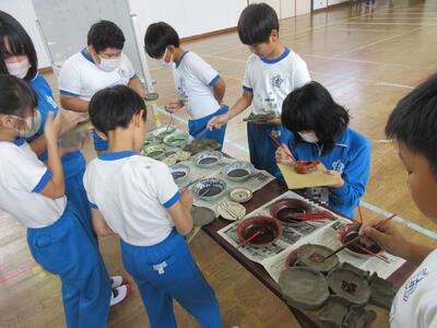 令和5年11月1日(水)に6年生、2日(木)に5年生を対象に陶芸教室を実施しました。図工の授業の一環として、6年生は、「思い出の絵皿づくり」として、小皿を2枚、湯飲みを1個、箸置きを1個作りました。5年生は、「使って楽しい焼き物づくり」として、小皿を3枚、箸置きを5個作りました。講師の先生は、いわき市の陶芸専門家の方です。とても分かりやすい説明と子どもたちも事前にデザインを考えていたため、時間内に素晴らしい作品を完成させることができました。6年生は、創立150周年を記念した文字や卒業を意識したデザインが見られました。どちらの学年の作品も、思い出に残る、しかも毎日の食事で活用できる作品になったと思います。