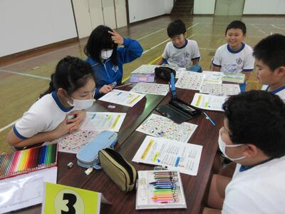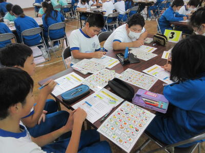 また、朝食メニューづくりを行いました。五大栄養素クイズをした後、メニューをエネルギー、体をつくる、体の調子を整えるの3つに分けて色分けすると偏りがあり、バランスのいい朝ごはんが大切なことがわかりました。