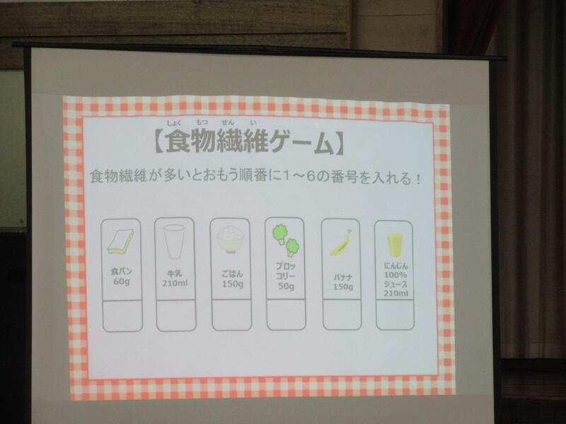 最後に、食物繊維は、排泄の量を多く、出やすくすると説明があり、食物繊維ゲームをしました。食パン、牛乳、ごはん、ブロッコリー、バナナ、にんじんジュースで多い順は?全問正解者はいませんでした。一番は、ブロッコリー、…。そして、参加した児童全員に、フルグラのお土産がありました。ご家庭でも、バランスのよう食事についてお話しください。