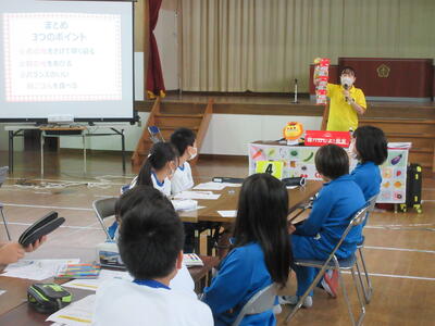 令和5年11月7日(火)5・6年生を対象に、「自分らしい朝をつくろう」をテーマとしたカルビーの出張授業、朝ハロしよ!教室を実施しました。学習内容は、①生活サイクル、②栄養素について、③バランスの良い朝食メニューでした。
