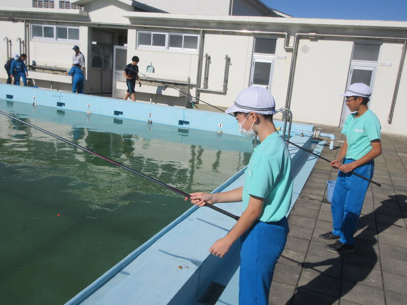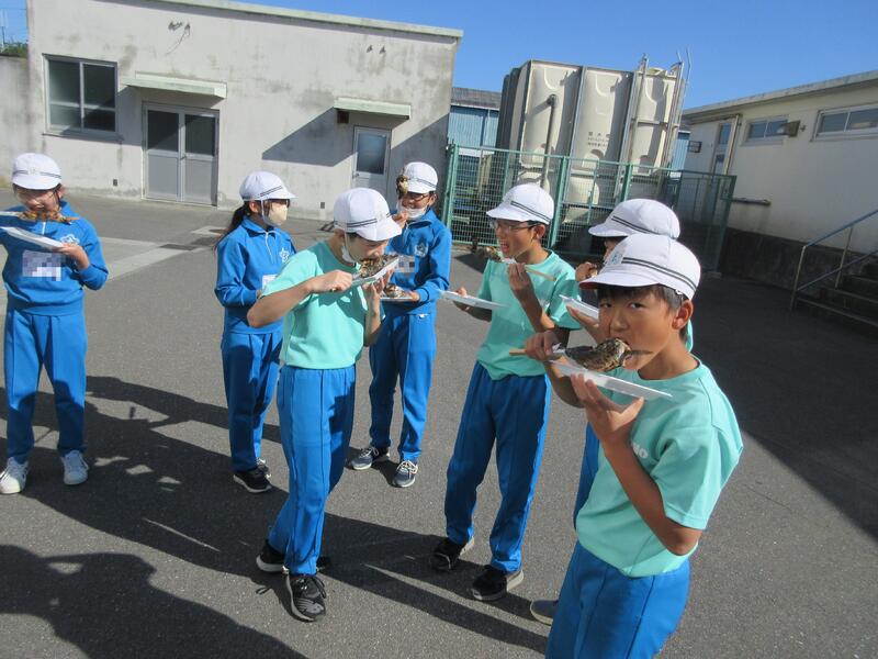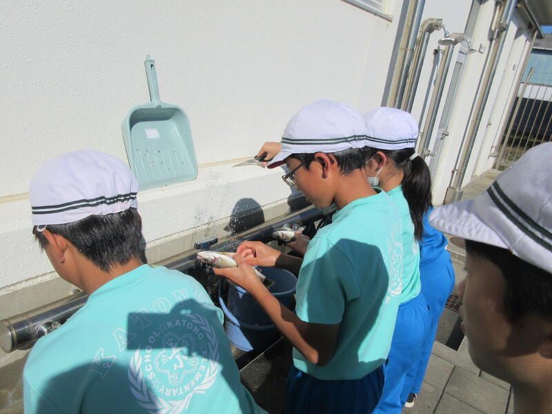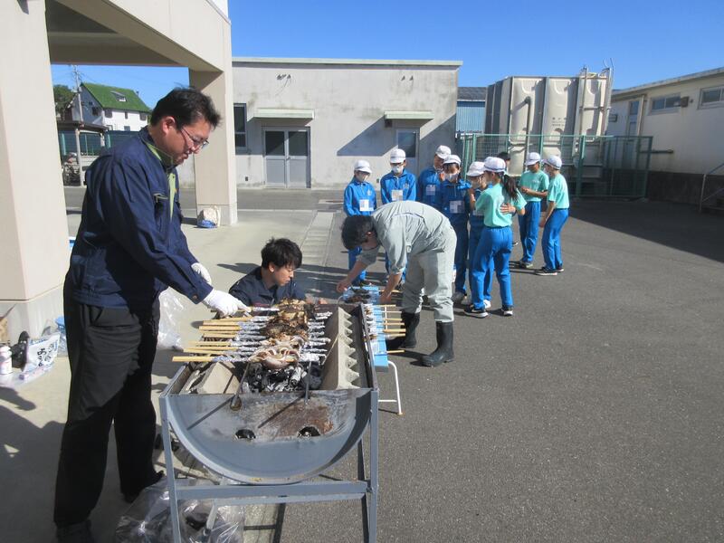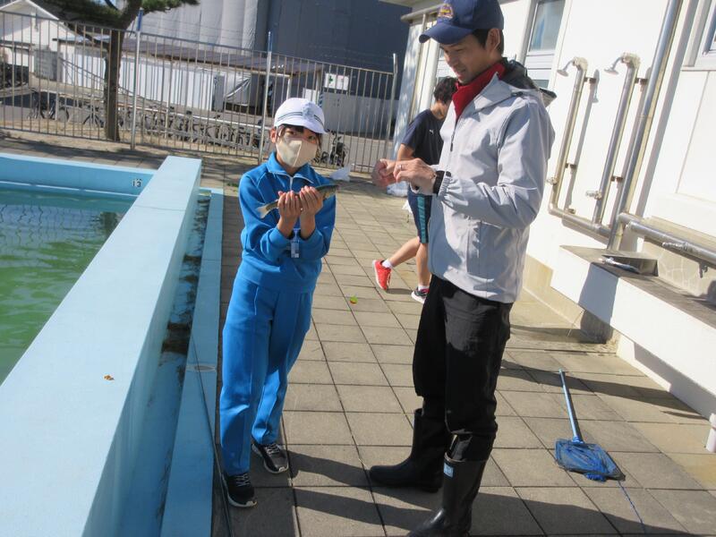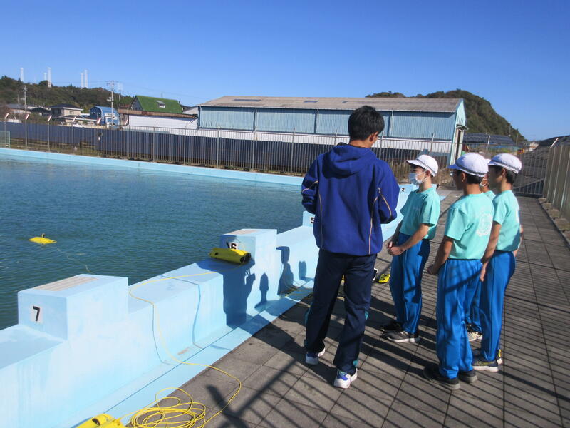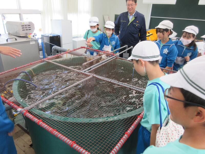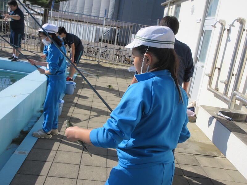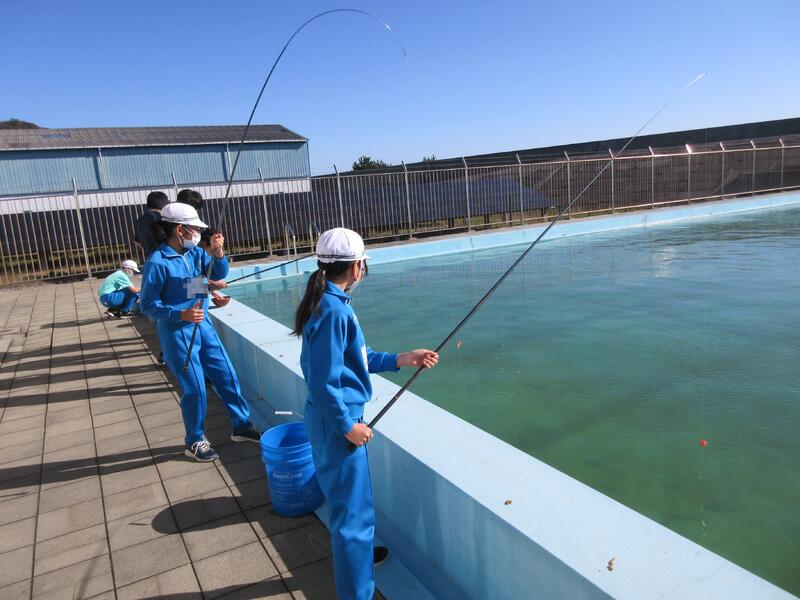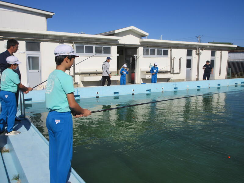 体験活動では、ニジマス釣りと、水中ドローンの2つのコースに分かれ、交代で体験しました。水産科の先生だけでなく、高校生も丁寧に指導してくれました。ニジマス釣りでは、うどんをエサに一人一人が、ニジマスを釣り上げ、さばいて調理しました。また、準備してあったニジマスの塩焼きを食事することもできました。水中ドローンでは、水中観測やセンサーを利用した水質管理について説明を聞き、水中ドローンの操縦に挑戦しました。最後に、最先端の陸上養殖施設も見学できました。 子どもたちは、学校ではできない貴重な体験をすることができ、地元の水産高校の学習を知るとともに、産業界で必要とされる人材や今後の水産業のあり方について、学ぶことができました。さらには、魚を捕る人、調理・加工する人がいて、食事ができると感謝の気持ちも感じたようでした。