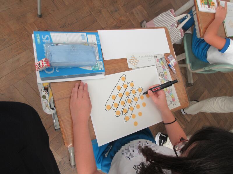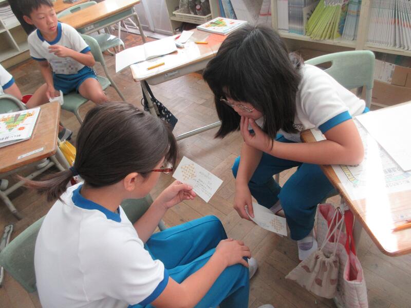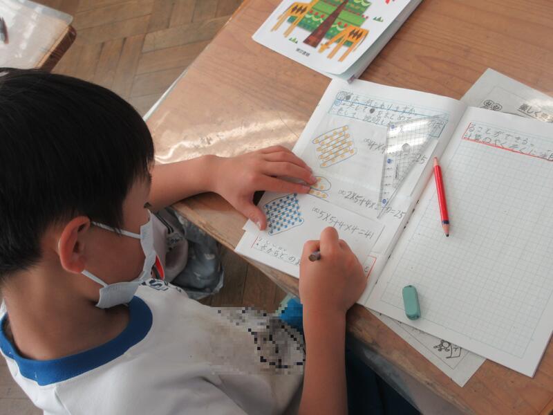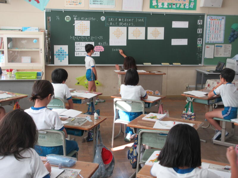 本時の授業は、「●(ドット)は、何個ありますか。」という問題を通して、ドットの並び方やまとまりに着目して、ドットの数の求め方を図や式を用いて考え、説明できるようになる学習でした。子どもたちからは、1つずつ数えることは面倒なので、同じ数のまとまりをつくればいい、かけ算でやればいいなどの意見が出されました。教師が1つの解き方を紹介することにより、子どもたちは見通しを持つことができ、次々と解き方考え、式に表していました。また、ペア、そして、全体で行った解決方法の話し合いでは、キーワードを知らせるとともに、子どもたちの言葉を大切に進めました。図から式に、式からどのように考えたか読み取ることにより、考えが深まっていくのが分かり、子どもたちは満足そうでした。まとめの後の適用問題(練習)にも、最後まで集中し、どの方法が簡単か、考えながら解いていました。