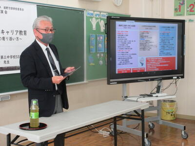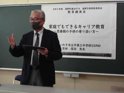 令和5年11月9日(木)、遠野町PTA研修委員会の主催による教育講演会を上遠野小で開催し、各学校の保護者の方が参加しました。講師は、市内中学校で、不登校及び不登校傾向のある生徒の学習機会を確保し、将来の自立を促すため、生徒や保護者に寄り添った支援をされているサポート・ステーション・ルーム・マネージャーの先生です。