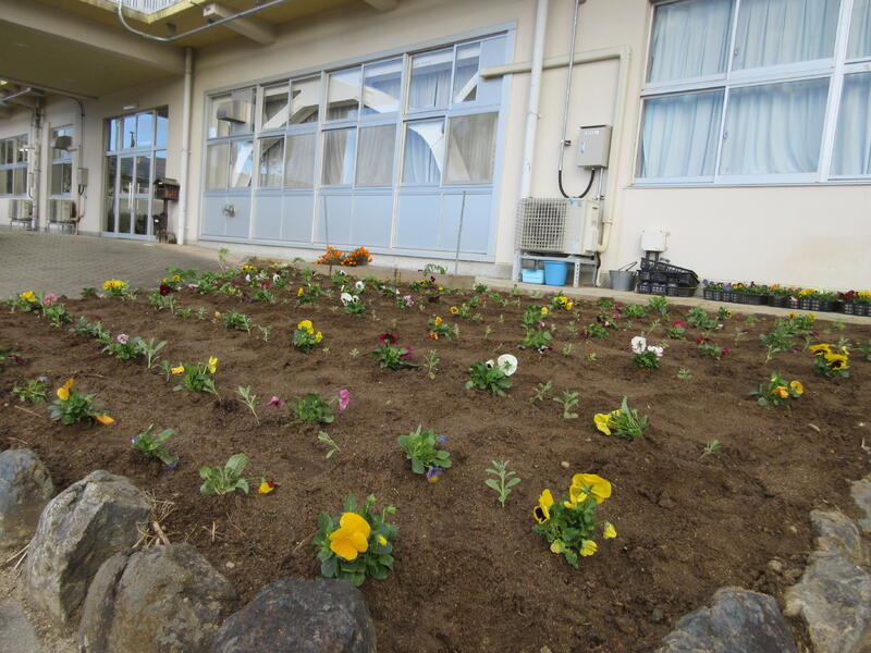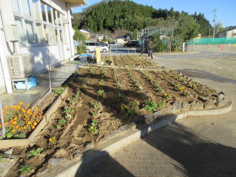 令和5年11月10日(金)と14日(火)に、お二人の用務員さんが、耕運機で耕すことと、花の苗を植え、肥料をまくことを分担し、花壇を整備してくれました。緑化環境整備のために遠野支所よりいただいた200株のパンジーの苗です。花壇が急に明るくなりました。花のある環境は心が和みます。冬から春、初夏まで楽しめそうです。