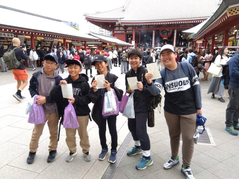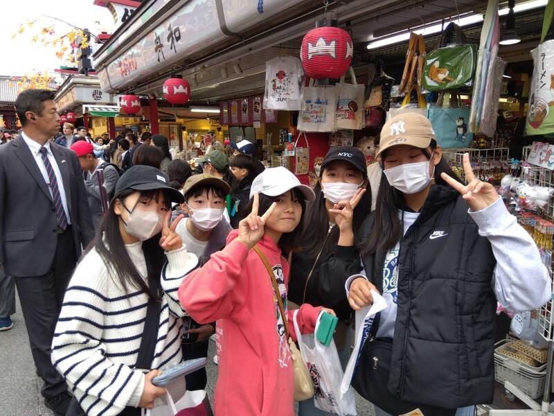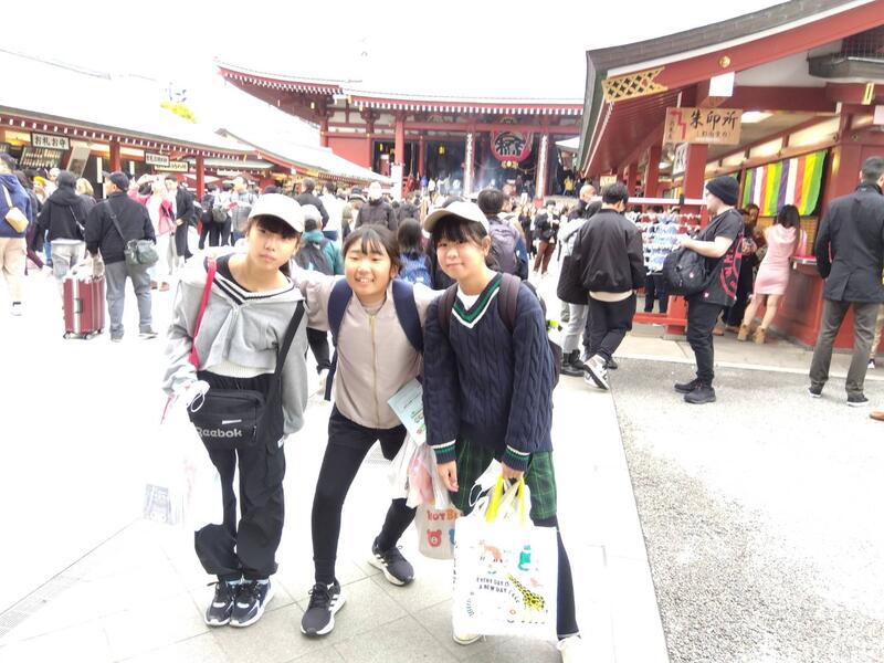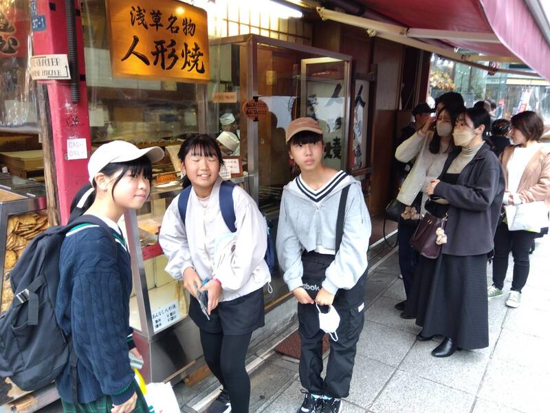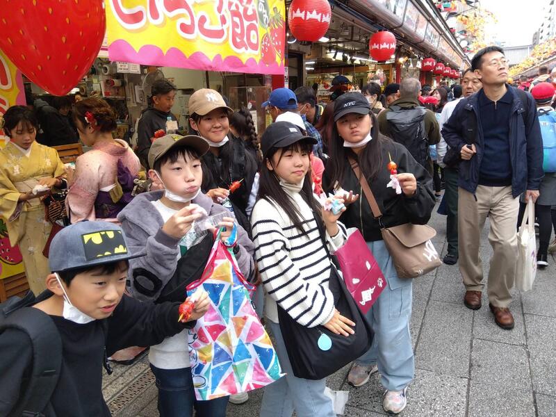 浅草では、浅草寺を背景に記念写真、その後、仲見世商店街を散策しました。浅草寺から雷門までの中で、事前に調べたお店を見つけてお土産を買ったり、食べ歩きをしたりしました。一番人気は、いちご飴。平日でしたが、外国の方を含め、観光客がたくさんいました。