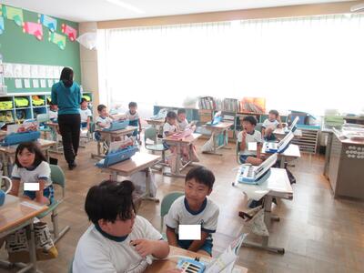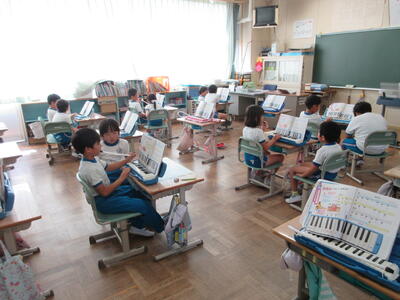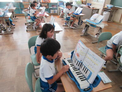 1年生は、鍵盤ハーモニカの練習に励んでいました。おとなりの友達に聞いてもらって、上手なところを教え合っています。先生からだけでなく、友達からもほめられると、ますますやる気がでますね。