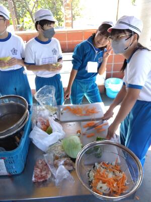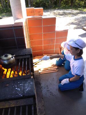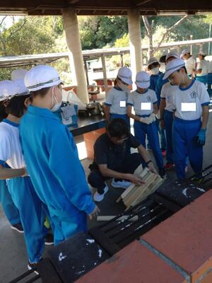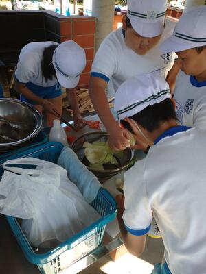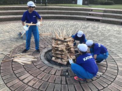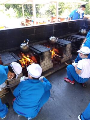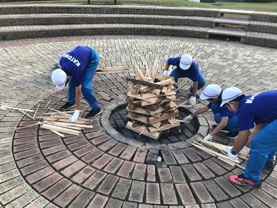みんなで楽しむために、レク係のみなさんは、協力しながら薪を組んで準備しています。このように、一人一人が責任をもって係の仕事に取り組むことも、宿泊学習を通して学んでほしい大切なことの一つですね。