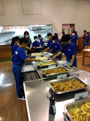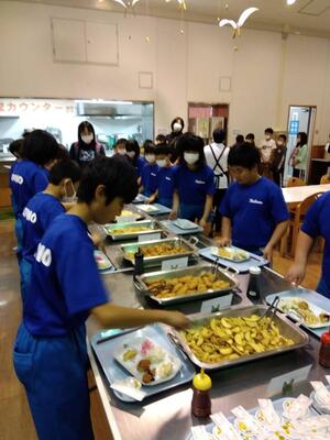 お楽しみのバイキング!メニューは、カレーライス、味噌ラーメン、とんかつ、レンコンのはさみ揚げなどなど。