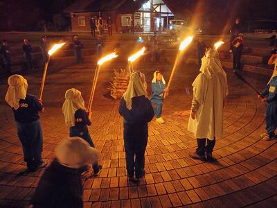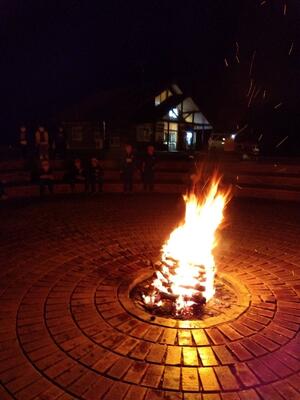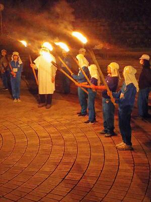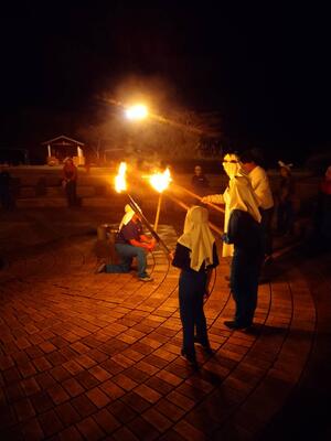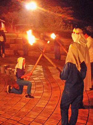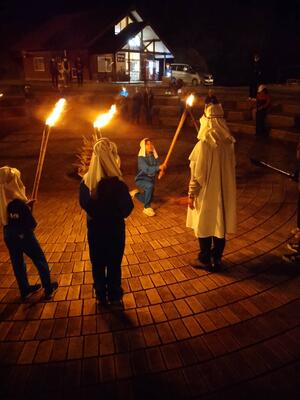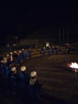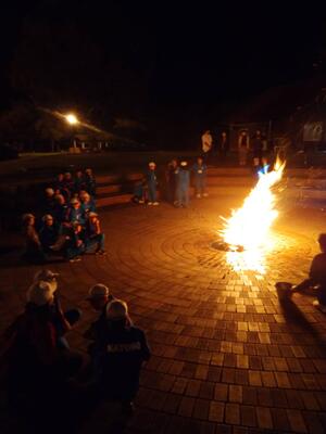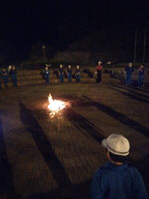 火の神から与えられた4つの火が、火の巫女と火の守によって中央の薪にうつされると、大きな炎が上がりました。気分も盛り上がって、みんなで歌を歌ったり、ゲームやマイムマイムを楽しんだりしました。そして最後は、小さくなっていく火を見つめながら、今日の思い出を振り返りました。