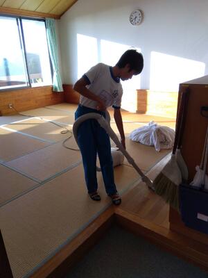 1日目、全力で活動したので、昨夜はぐっすり?眠れたようで、疲れも見せずに、全員が午前6時に起床しました。その後、部屋や施設の清掃をしています。「来たときよりも、きれいに!」「次の人が、気持ちよく使えるように」と、一生懸命活動していました。