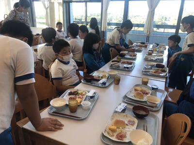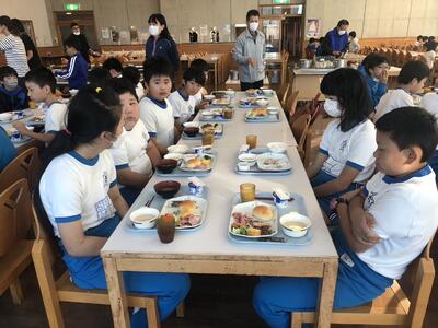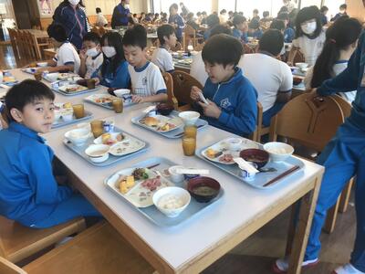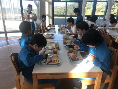 体調をくずす子もいなく31名全員で、朝ご飯をもりもりいただきました。ちなみに、メニューは、「バターロール・クリームスープ・ベーコンソテー」の洋食と、「ご飯・味噌汁・鮭の塩焼き・ぜんまいの煮付け・厚焼き玉子」の和食です。