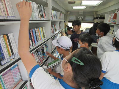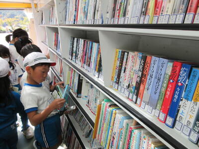 令和5年10月13日(金)、月に一度の移動図書館「しおかぜ号」が来校しました。各学級の係のお友達が、たくさんの図書の中から、みんなに読んでもらいたい図書を選んでいました。