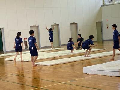 前転~開脚前転~後転~開脚後転と課題は少しずつ難しくなっていきますが、手をつく位置や最後のポーズ等、大事なところをしっかり意識しながら取り組んでいました。
