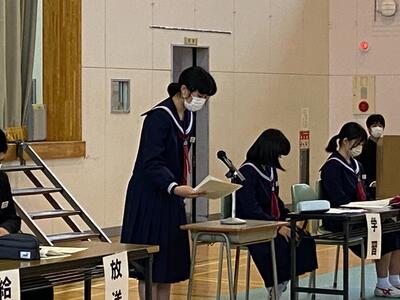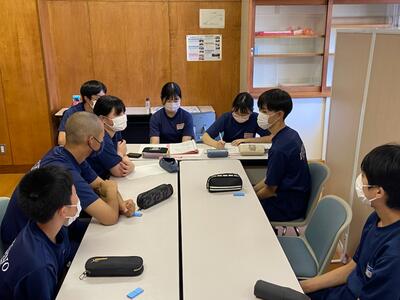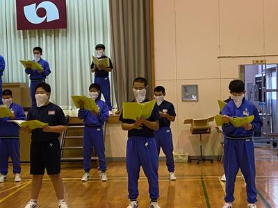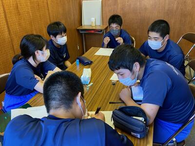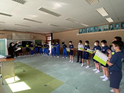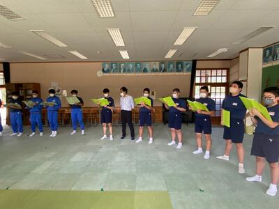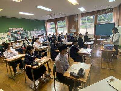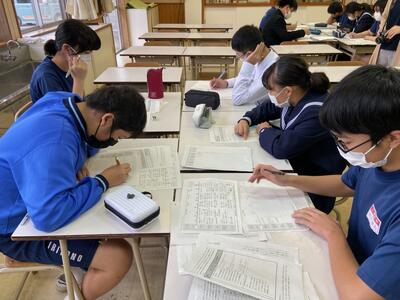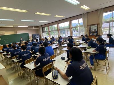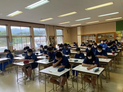 市内の高等学校から先生方をお招きしての「高校説明会」は1学期に実施しているので、今回は先週行われた「入試要綱説明会」(市内全中学校長及び進路指導担当を対象にした会議)の内容を受けて、担任から県立高校入試の日程や手続きの詳細などについて説明しました。
