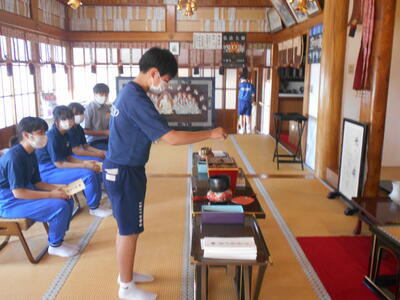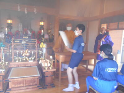 徒歩で円福寺に移動し、ご住職から遠野地区の歴史等について貴重なお話をいただくとともに、お経や護摩札のお焚き上げも体験させていただきました。
