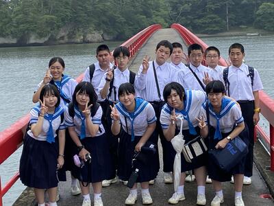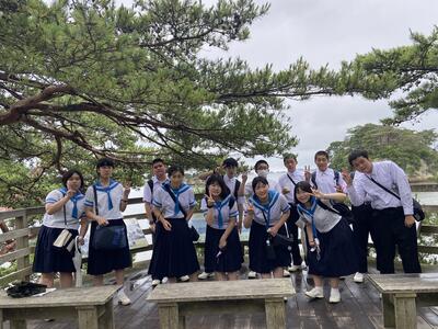 笹かま手焼き体験の後は、1時間程度福浦島を散策しました。福浦橋をバックに記念撮影。