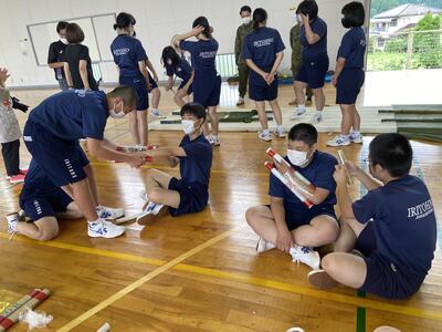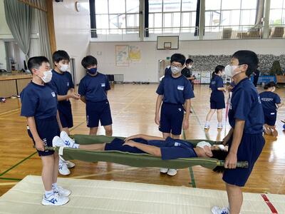 竹や毛布・Tシャツを使って担架を作ったり、骨折部位を傘やサランラップを用いて固定したりしています。