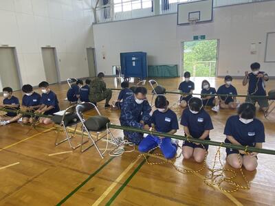 非常時に役立つロープの結び方、もやい結びを教えていただきました。完全にマスターして、早さを競っているグループもありました。