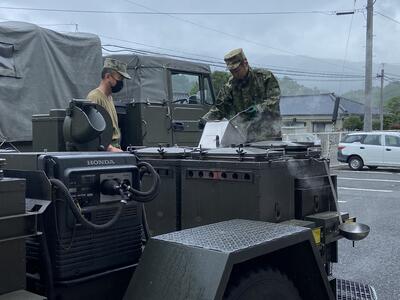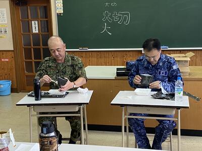 昼食は、炊事車でボイルしたレトルトカレーライスです。自衛隊の方々にも教室に入っていただき、楽しくいただきました。