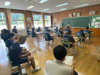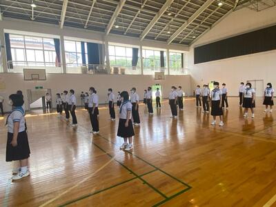本日、令和4年度1学期の終業式を迎えました。式の後には、代表生徒が学年の反省を述べるとともに、各担当教師から、夏休みの生活や部活動についての話がありました。