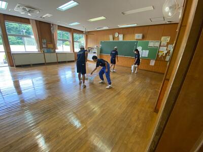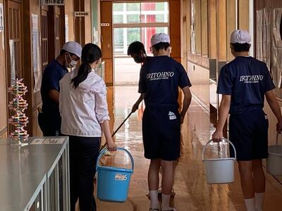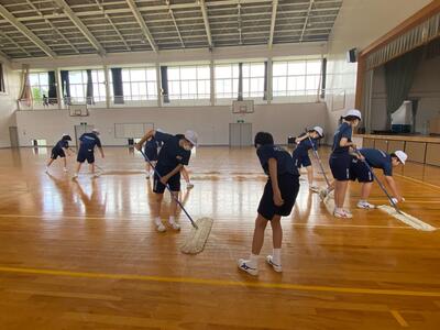愛校清掃では、各教室・廊下等のワックスがけを行いました。3年生が、1年生に丁寧に手順を説明する様子が見られます。