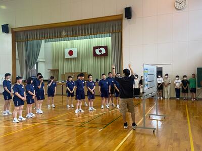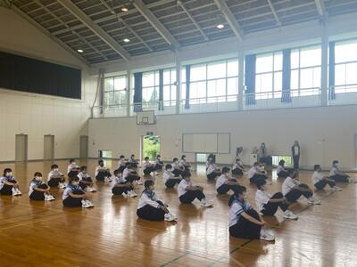 【3年生保健体育】バレーボールのレシーブ時に意識するのポイントを確認した後は、実際に6年生の前で披露しました。