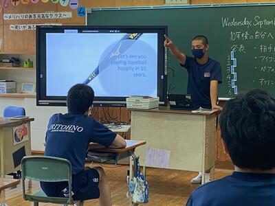 【2年英語】将来の自分に宛てた手紙をパワーポイントを使って披露。難しい単語もスラスラ読み上げる様子に拍手が起こりました。
