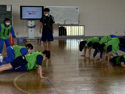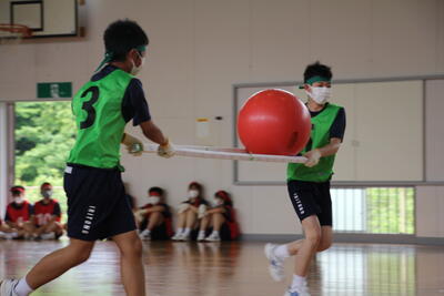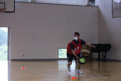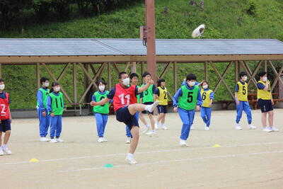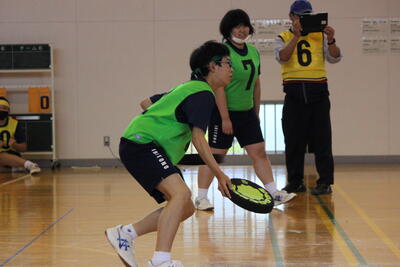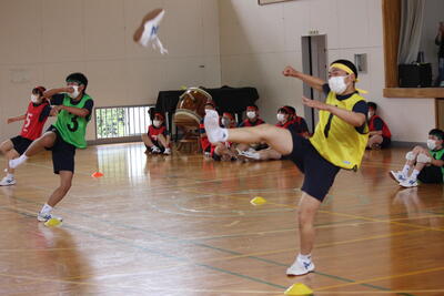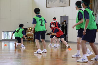 5 【フリスビードッジボール】 2つのフリスビーが飛び交う中、果敢にフリスビーを取りに行ったり、しなやかにかわしたりと、ファインプレーが随所に見られました。(先生方も頑張りました!)