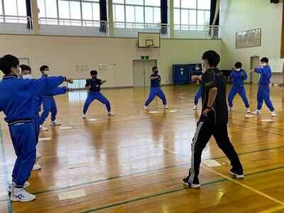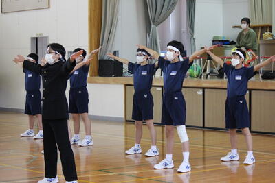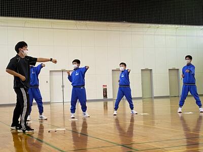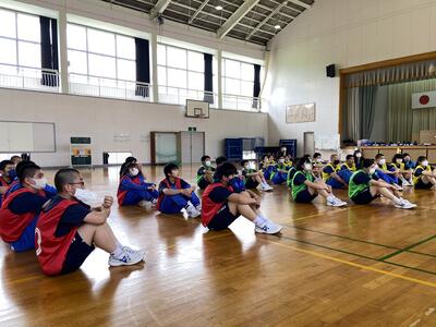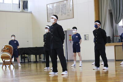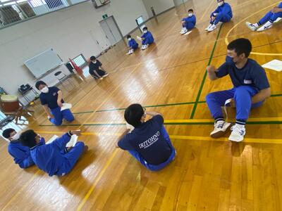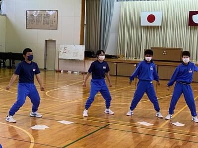 中体連選手壮行会に向けて、応援団の練習がスタートしました。初回の今日は、役割分担と簡単な動きの確認です。